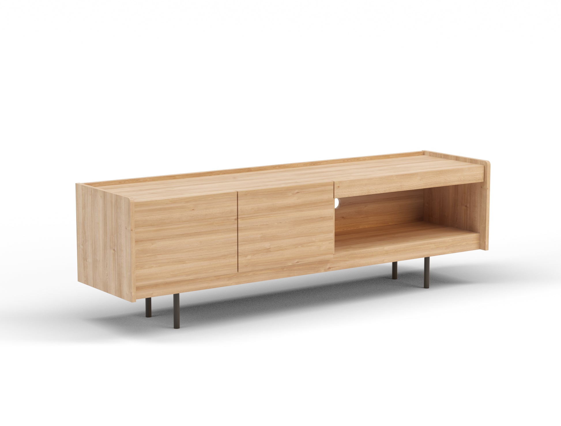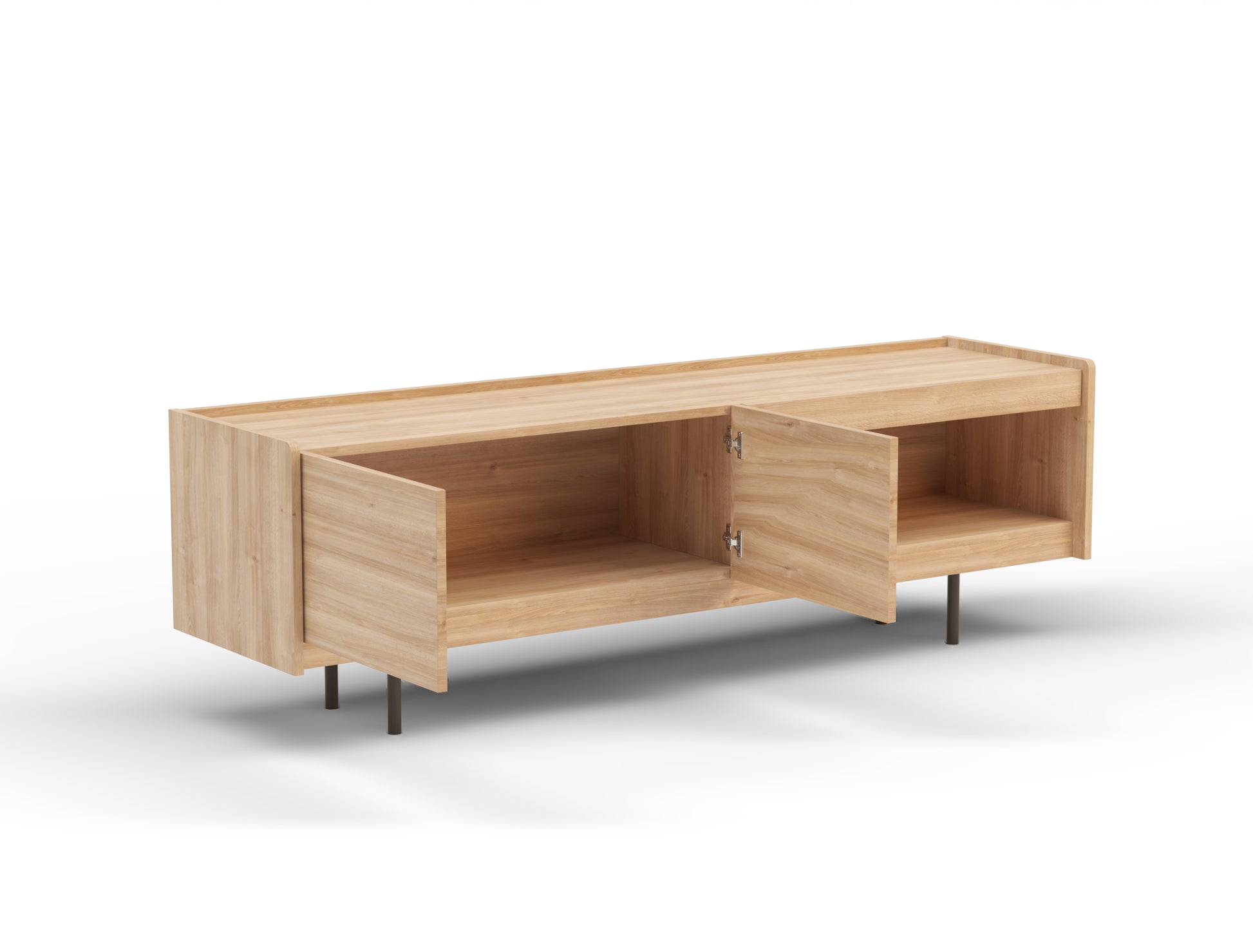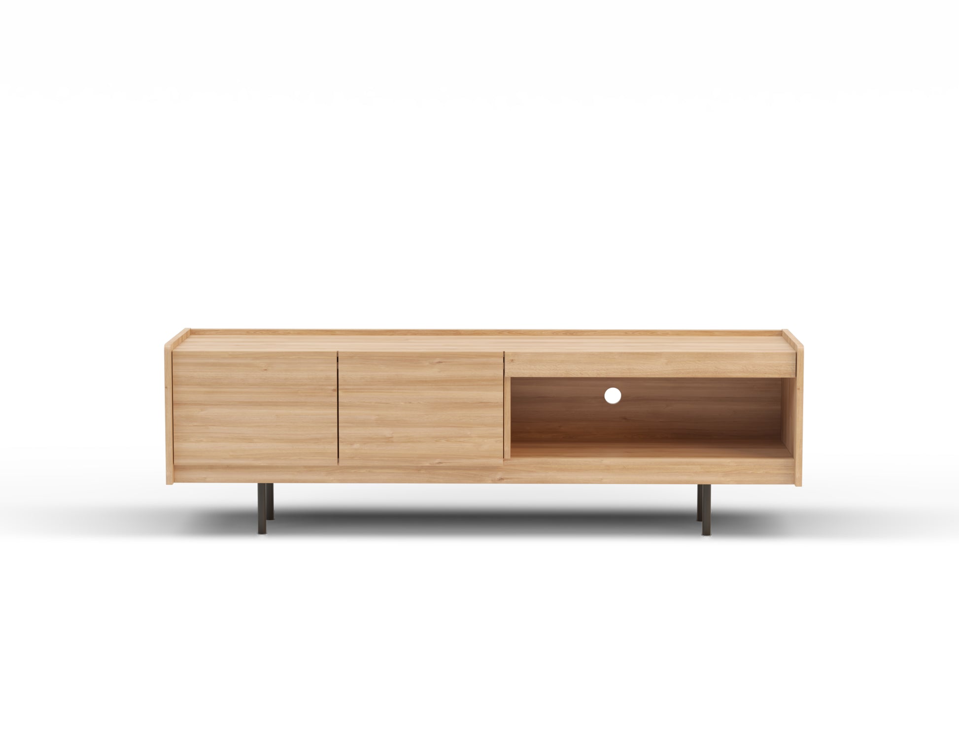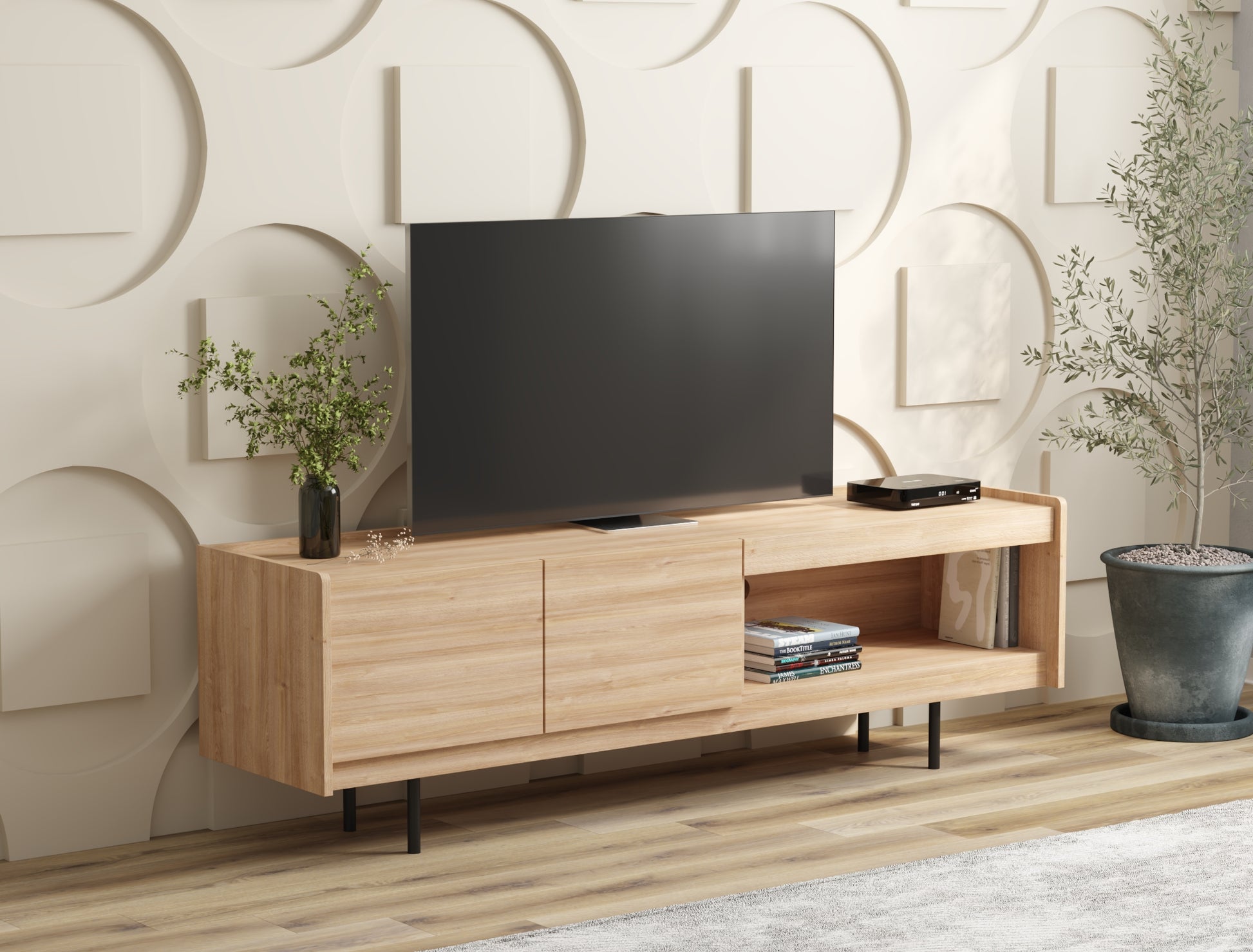 Elevate your home with the modern charm of the 180cm Benjamin Entertainment Unit, featuring a beautiful blend of oak woodgrain panels and sleek black feet."