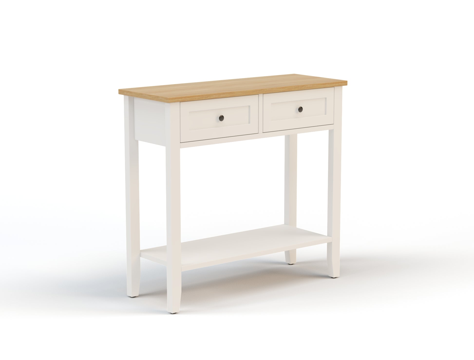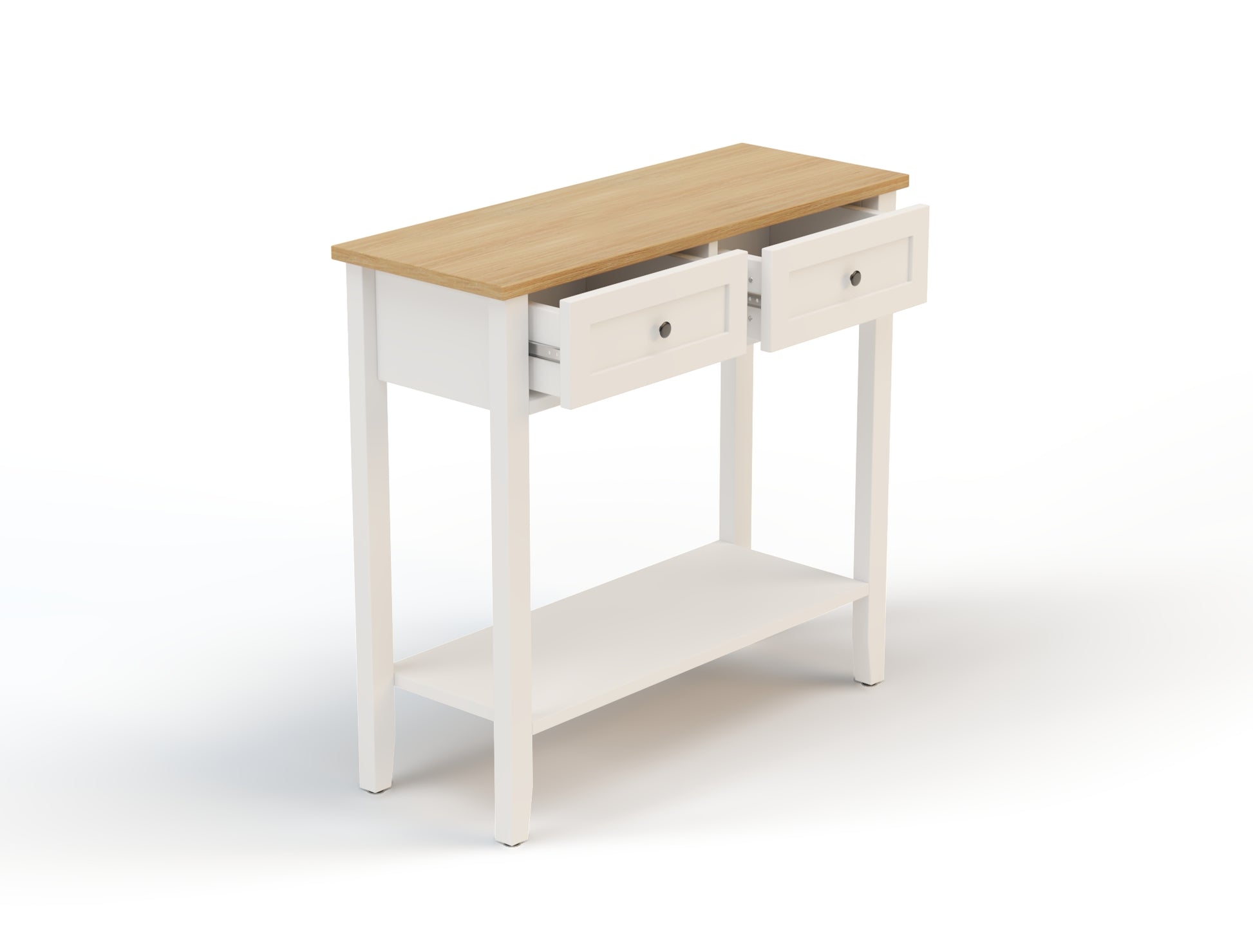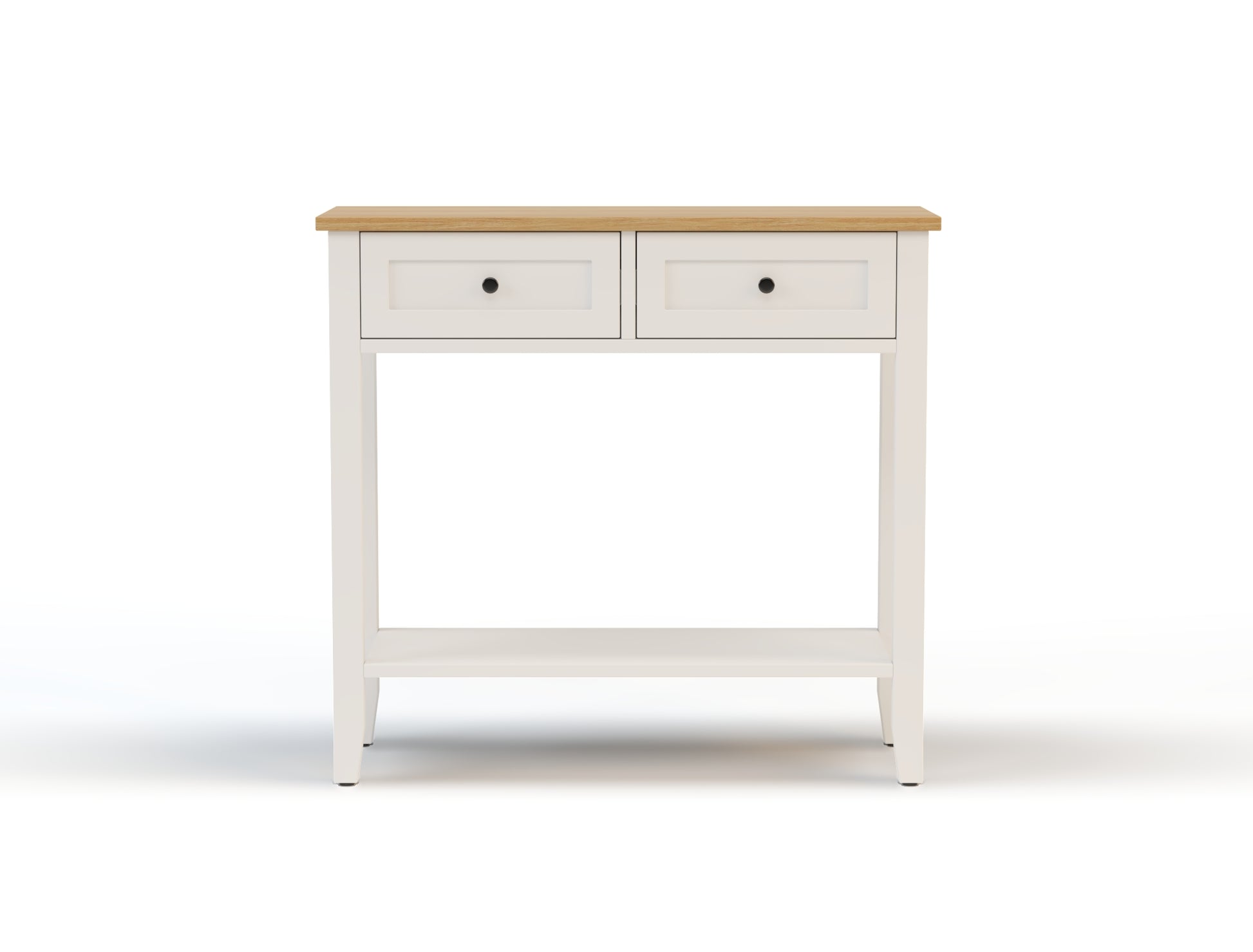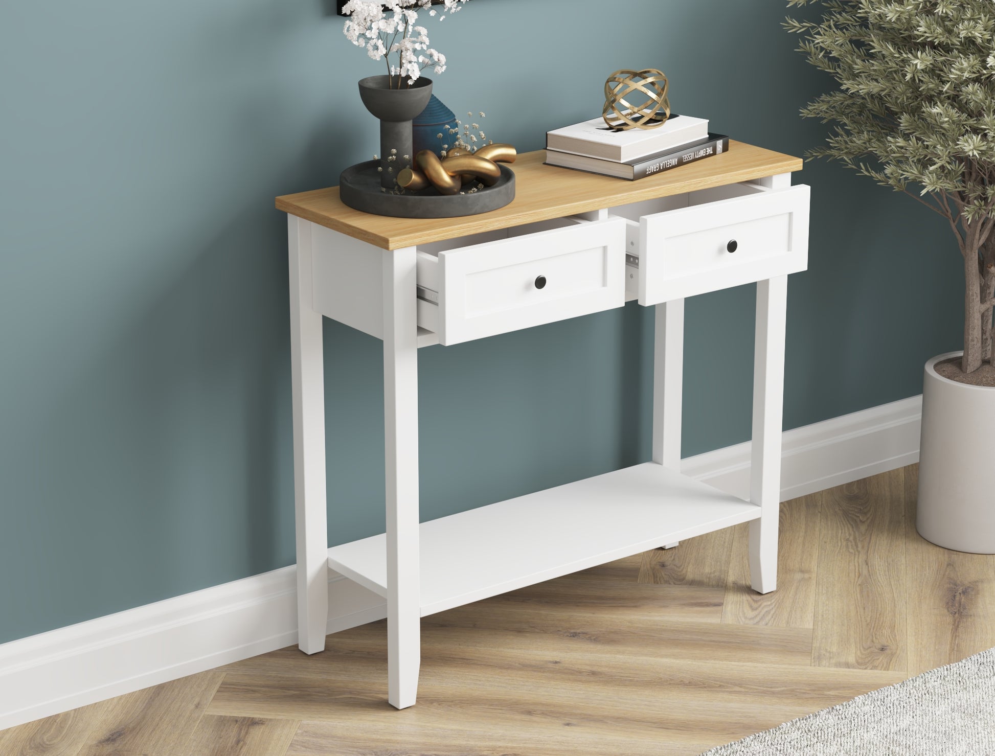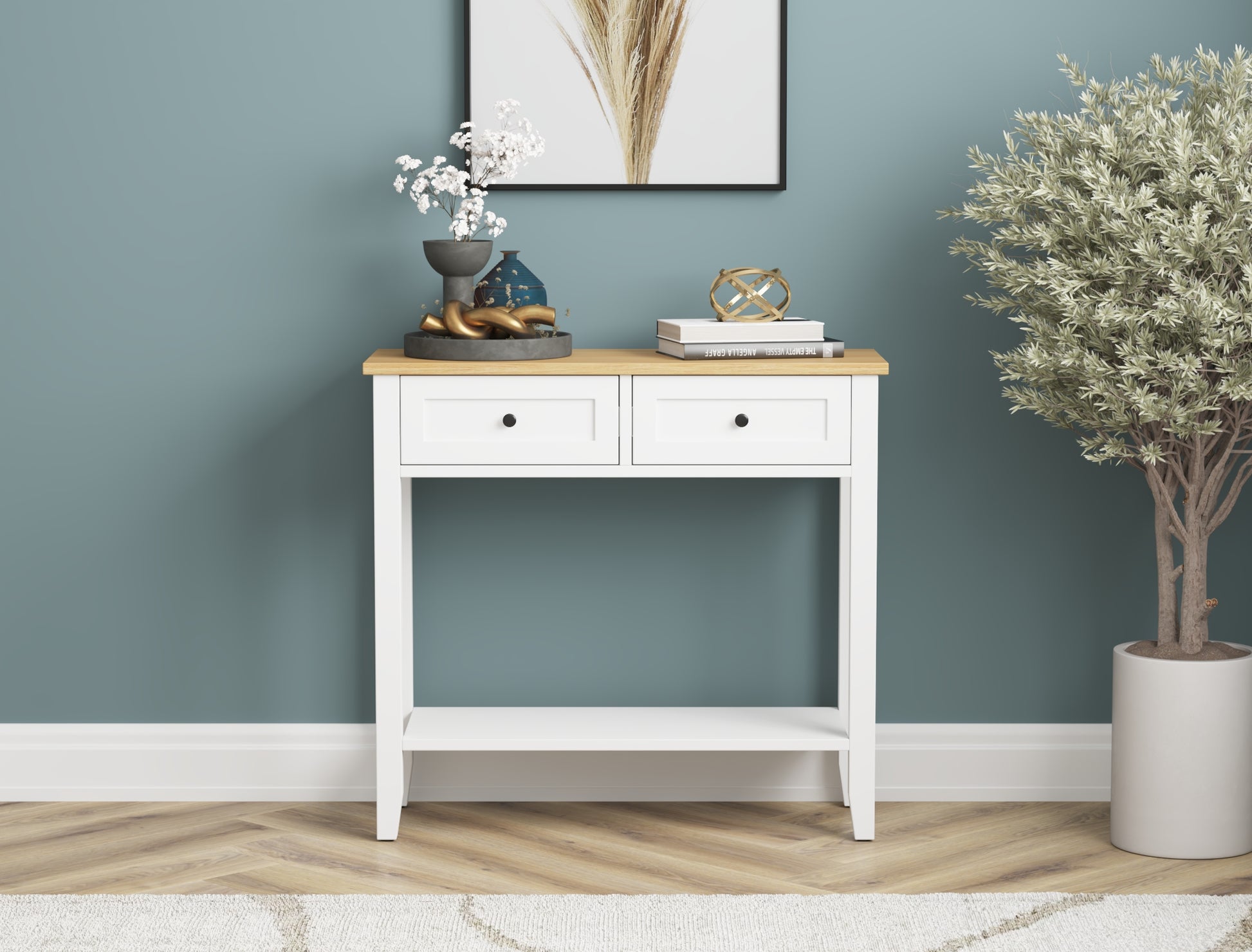 The unit's white particleboard construction is beautifully complemented by an elegant woodgrain top, creating a sophisticated visual contrast.