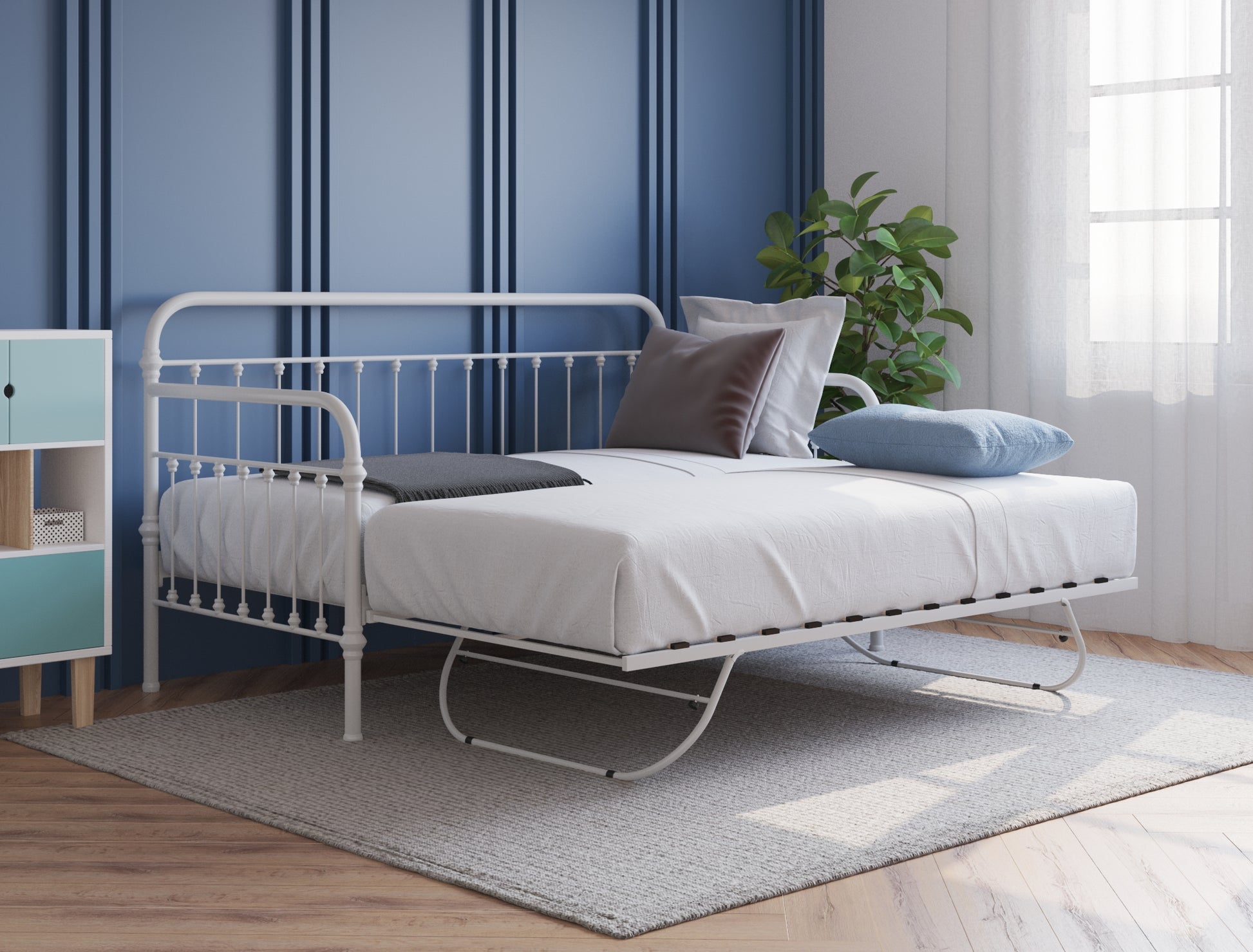 Featuring a metal frame with backrest and armrests, this trundle bed is designed to last for years. Its lower bed comes reinforced with foldable legs that you can expand to adjust its height.