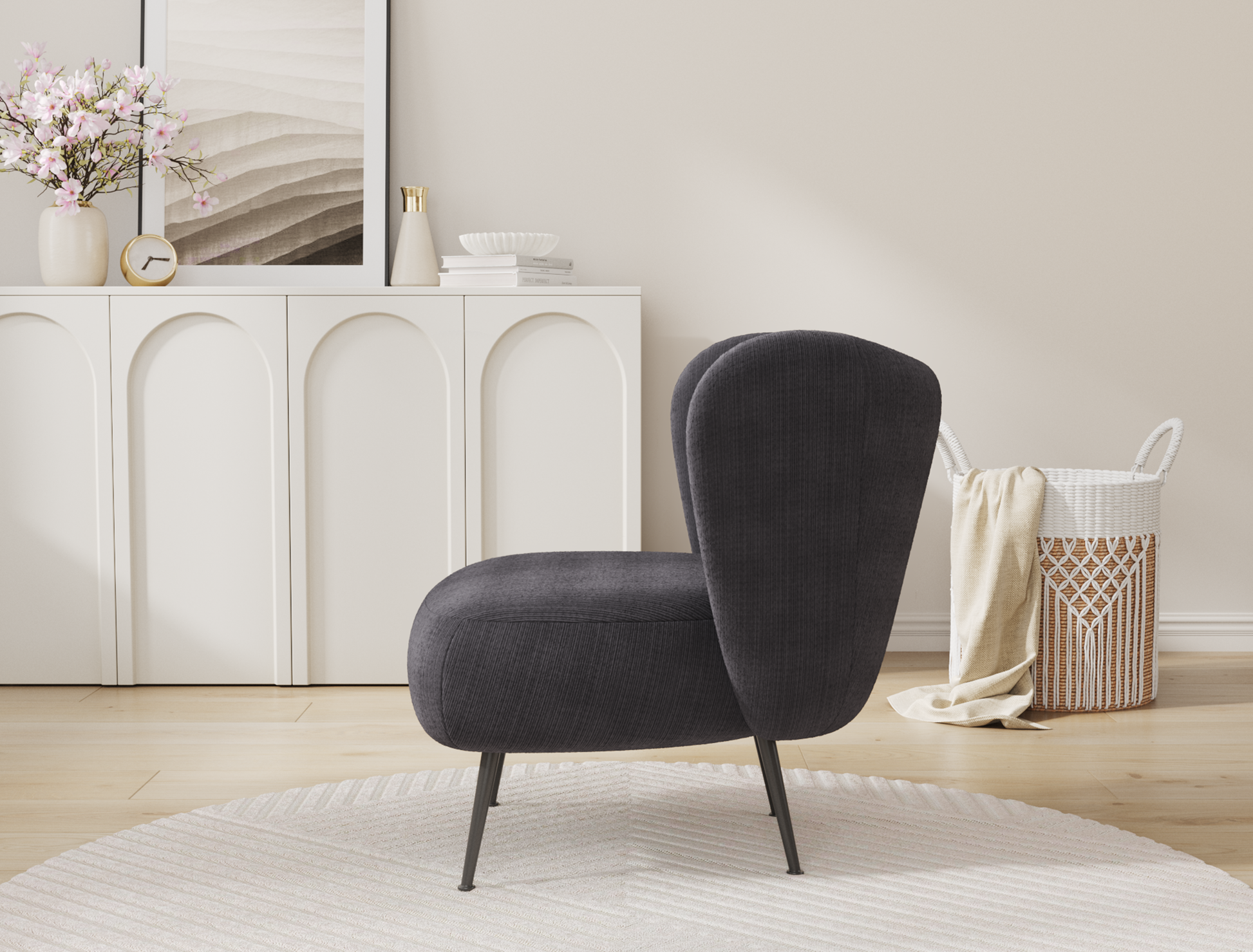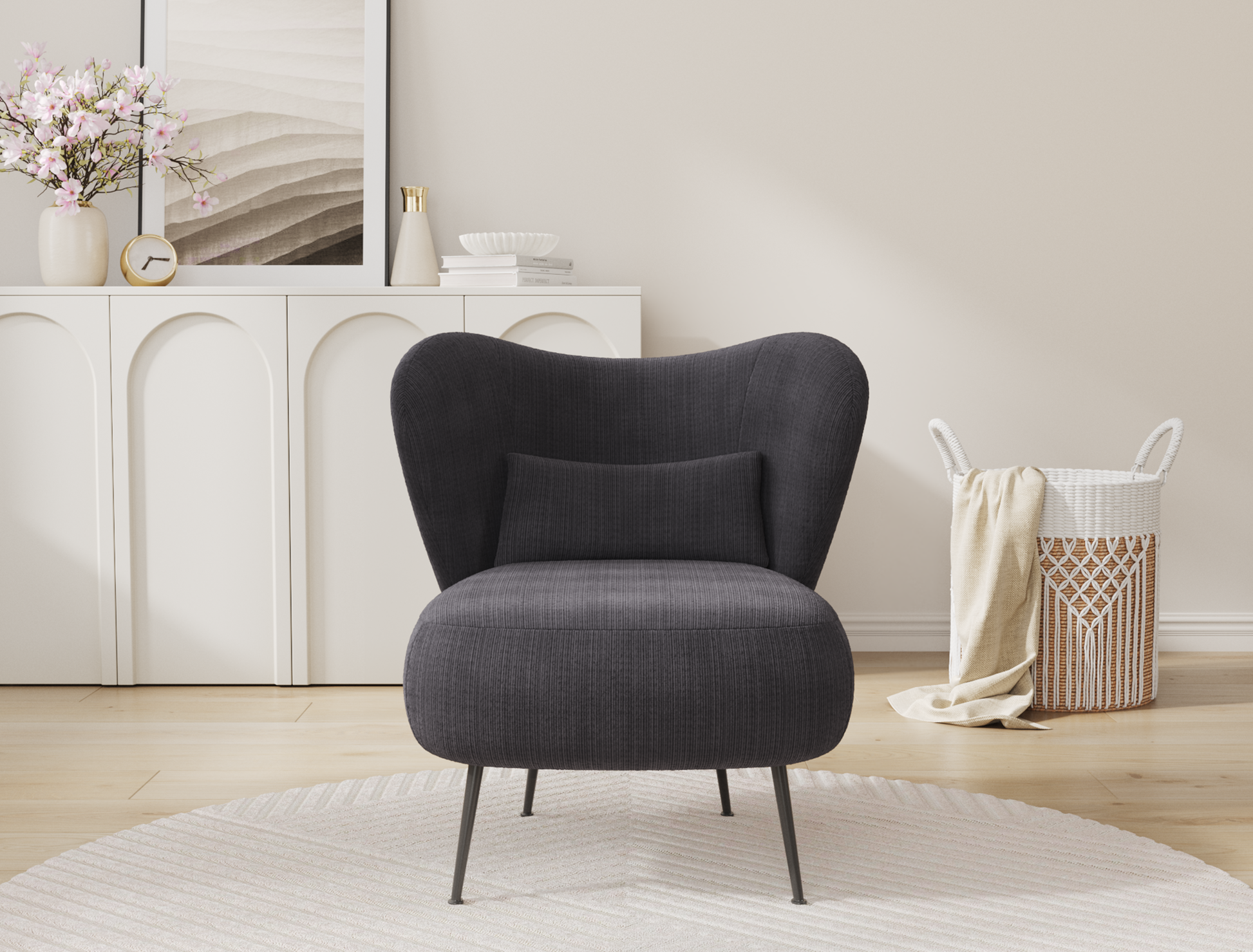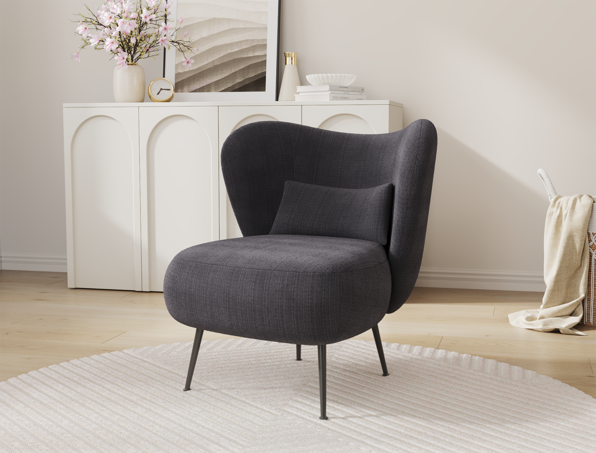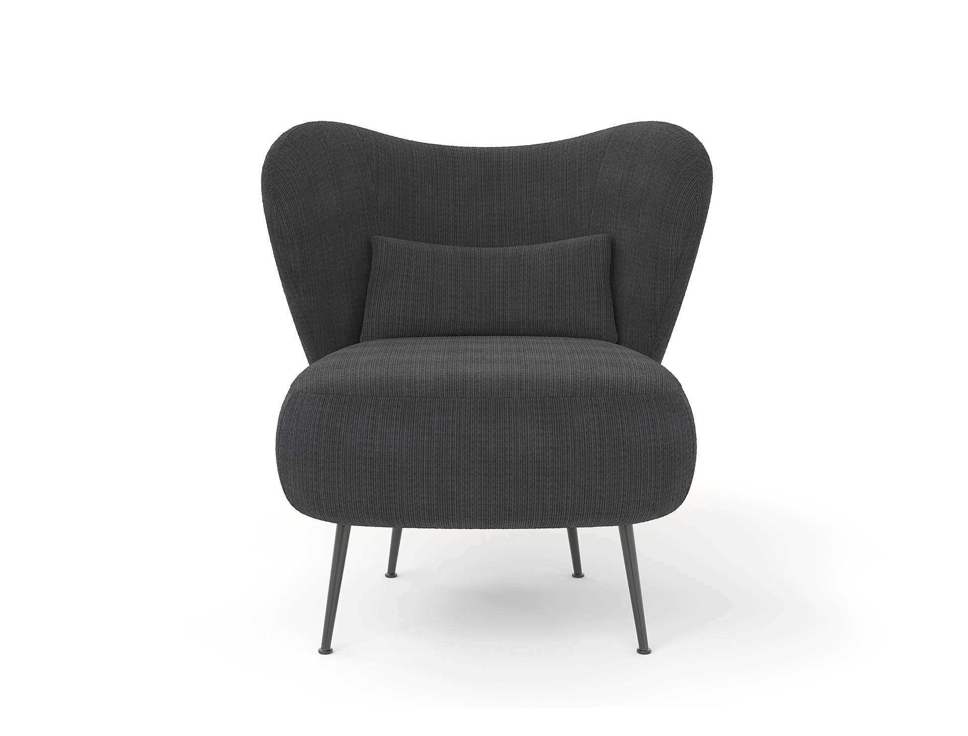 Everyone has a favorite armchair, and this one is about to become yours. With its wide, deep seat and winged backrest, it offers maximum comfort and full body support. The luxurious corduroy velvet upholstery feels soft to the touch, while the sturdy wooden frame and splay black powder-coated metal legs ensure stability. High resilience foam and extra thick padding make it a truly supportive seat, and the included lumbar pillow adds extra back support. Smooth, rounded corners complete the refined design.