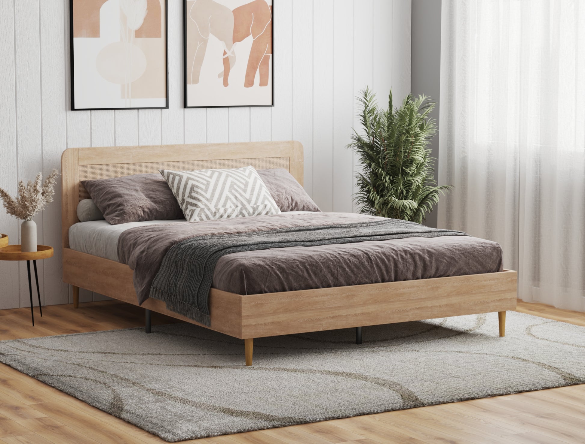 This bed features a modern rattan headboard that suit modern as well as contemporary decor styles. Plus, its exposed wooden surface makes it an appealing centerpiece in your room.