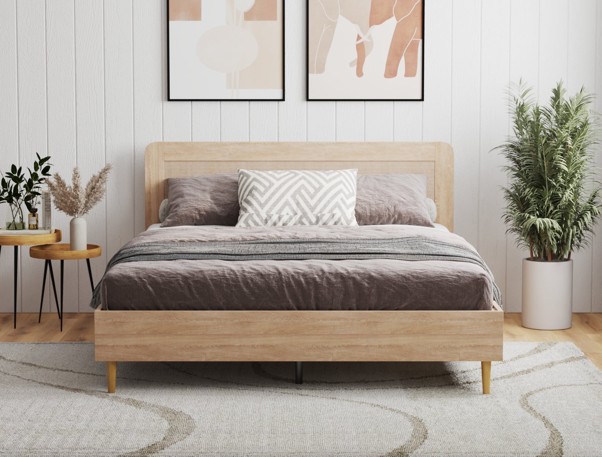 Made from the natural rattan headboard, this wooden bed frame is sturdy enough to let you sleep comfortably for several years to come. This bed is an excellent addition to a spacious bedroom with a minimalist décor style. Plus, the robust slats can easily withstand the weight of a thick mattress and people sleeping on it.
